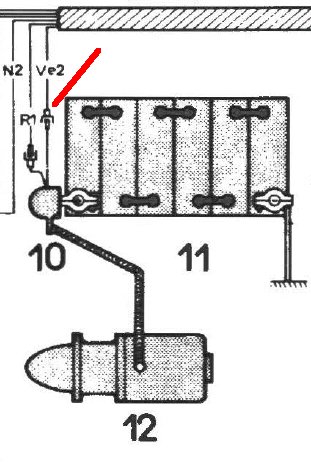 Das Kabel Ve2 kommt aus dem Gelbon-Relais raus, und geht über einen 4mm Rundstecker in den Kabelbaum. Wenn ich es richtig verstanden habe, sind in den Citroën-Schaltplänen, alle Kabel mit gleichen Nummern fest miteinander verbunden. Im Kabelbaum selbst verzweigt sich das Kabel offensichtlich und erscheint dann an verschiedenen Stellen, als Ve2 oder N2, beispielsweise am Lichtschalter, am Zündschloss und bei modernen Wagen an diversen Relais für die Beleuchtung. Die Buchstaben (Ve = vert = grün) und (N = noir = schwarz) haben technisch keine Bedeutung, sie bezeichnen die Farbe der Isoliertüllen am Ende der einzelnen Kabel.