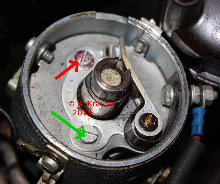 Mit der Excenter-Schraube mit dem grünen Pfeil ("Drehwinkel") verstelle ich den Unterbrecherabstand und damit den Schliesswinkel.