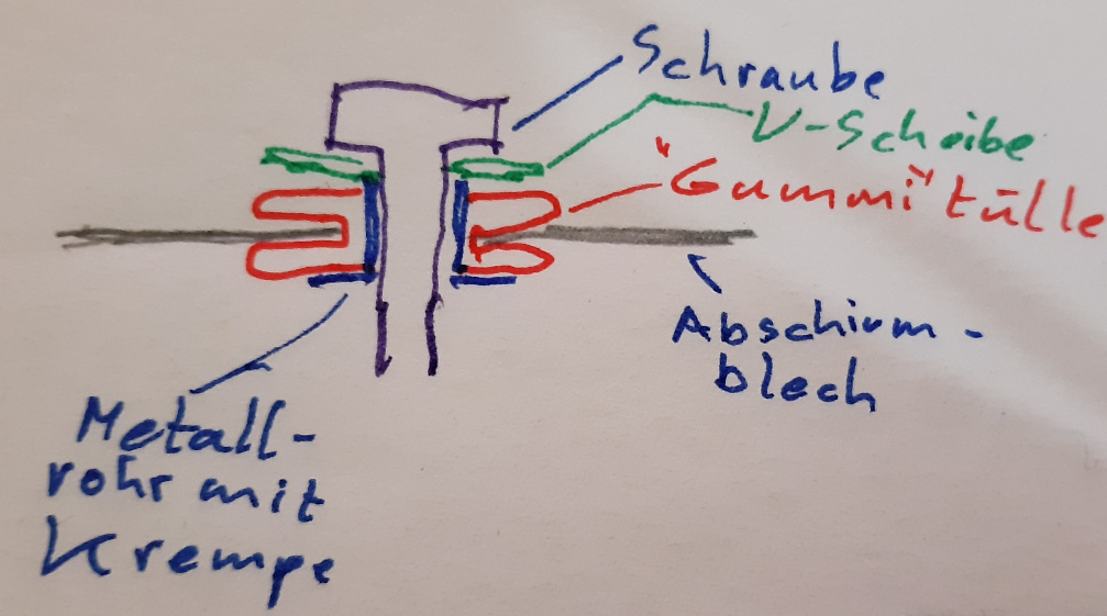 Die Gummitülle wird durch die Schraube nicht zusammengequetscht. Zur Innenseite verhindert das das Metallröhrchen mit seiner Krempe, auf der Aussenseite wird das durch die Unterlegsscheibe (grün) verhindert.Durch das Metall-Innere kann man die Befestigungsschraube richtig festziehen, was nicht möglich wäre, wenn man einfach aussen und innen irgendwelche elastischen Kunststoffscheiben zwischenlegen würde.