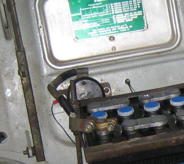 Beim Panhard ist das besser gelöst (Serie), die Minusleitung der Batterie geht da mit einem sehr kurzen Kabel direkt auf einen an der Spritzwand verschraubten Masseschalter, der von innen mittels Bowdenzug am Armaturenbrett betätigt wird. Keine langen Kabel von der Batterie zum Schalter und zurück. Hier hinter der Batterieecke zu sehen: