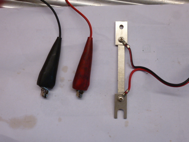 Er hat als Anschluss ein rotes Kabel, ein schwarzes Kabel und ein rot-schwarzes zweiadriges Kabel, das mit einer Metallbrücke verbunden ist.