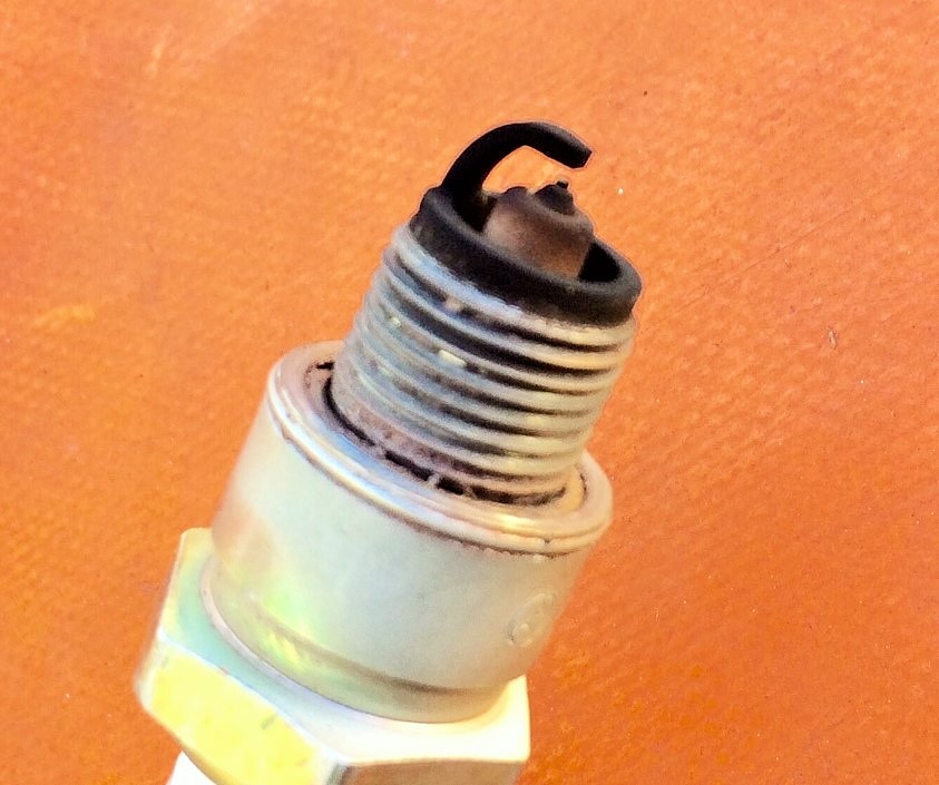 Nach ca 130 km Fahrt zeigt die Zündkerze sowohl an der Masseelektrode als auch am Fußisolator Ansätze von "Rehbraun". Zündkerze NGK Platinelektrode.