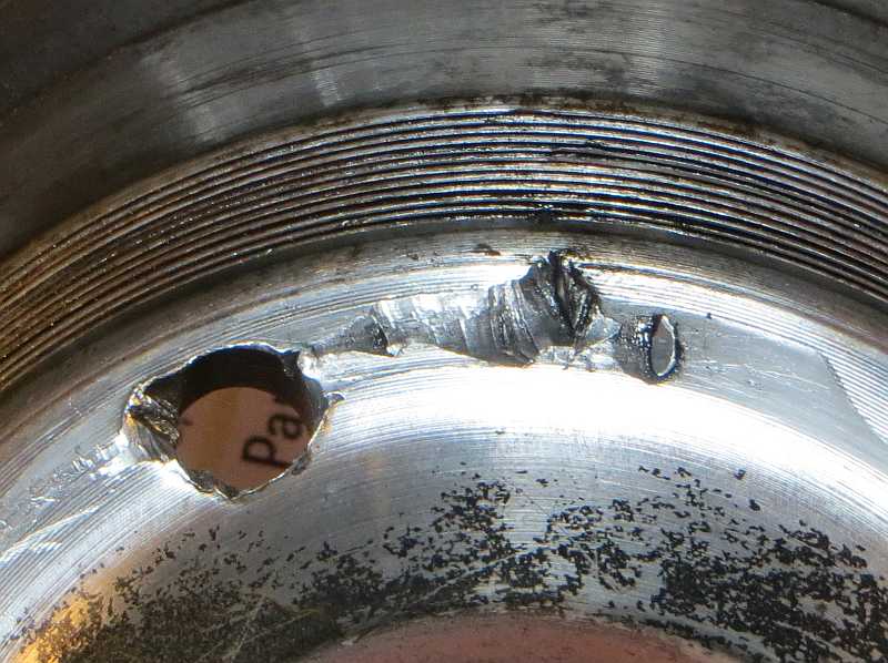 Die Innenseite der Radnabe, die Pfeile zeigen auf das Loch des fehlenden Bolzens und eine schadhafte Stelle in der Radnabe: