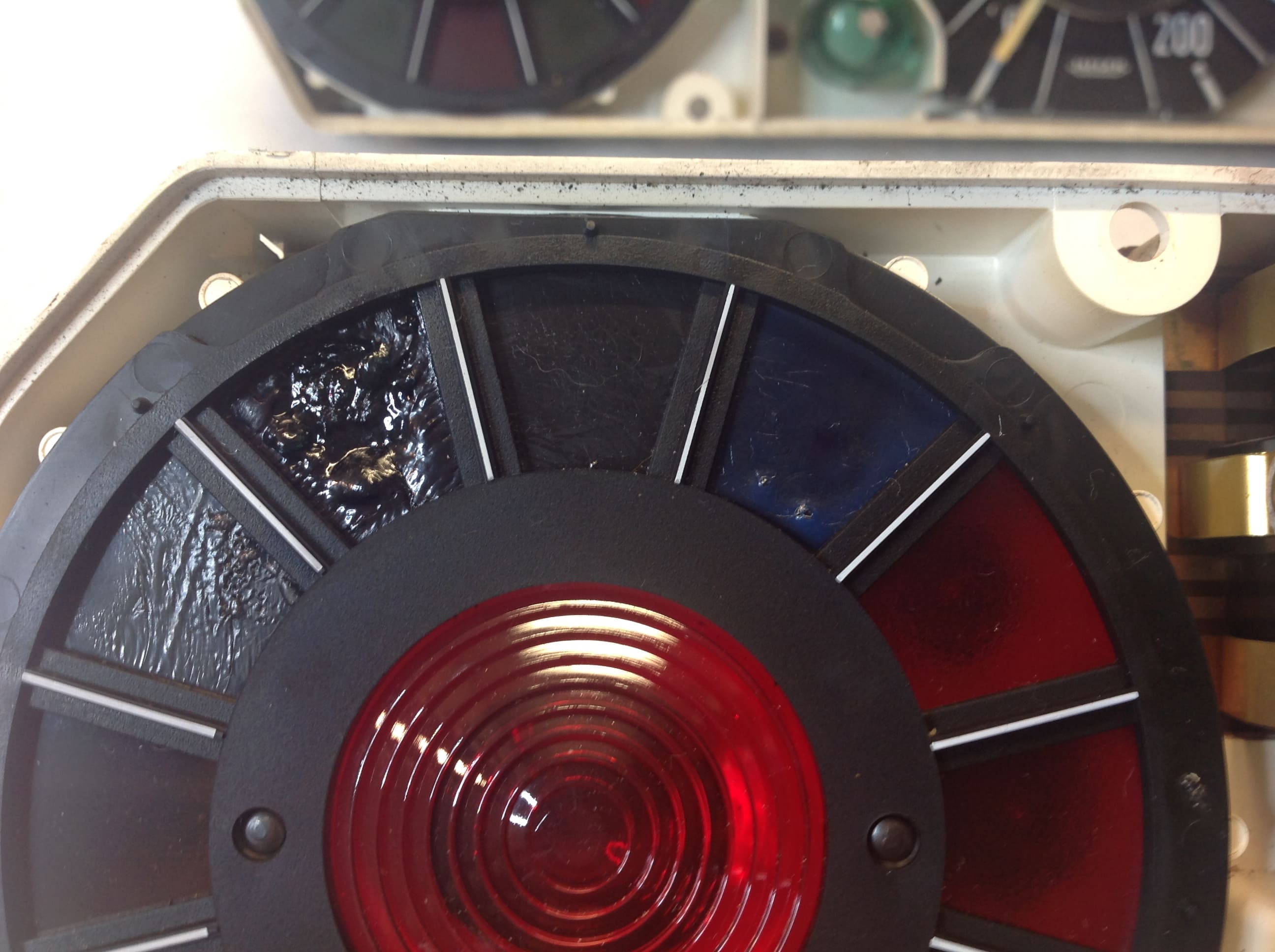 Die blaue Fernlichtkontrollleuchtenfolie habe ich ausgebaut und dünner geschliffen. Auch dort ist nun wieder eine einwandfreie Funktion mit genau der richtigen Helligkeit.