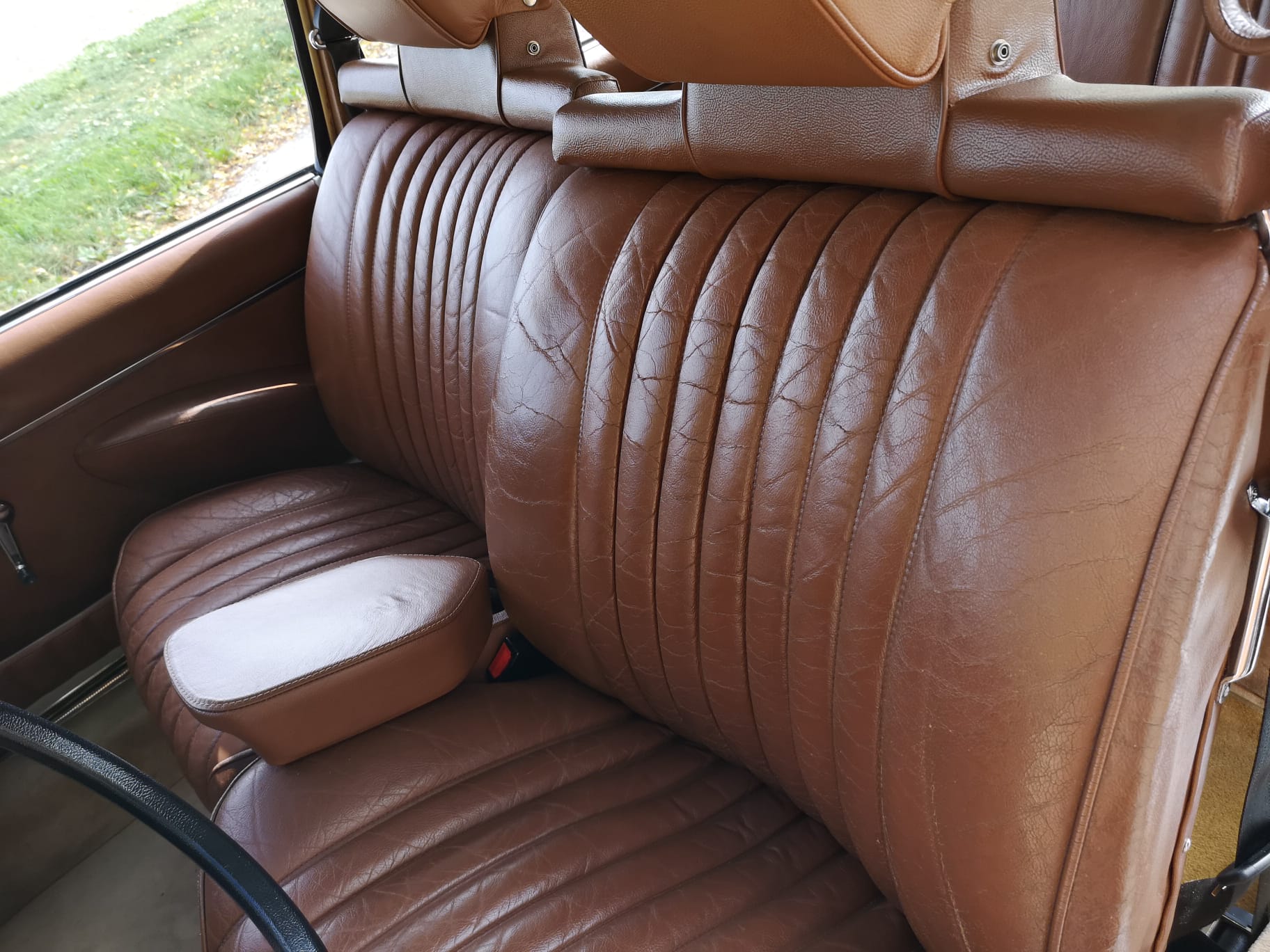 Alle Kleinbleche sind feuerverzinkt und braun lackiert. Originalinterieur: Leder Tabak. Armaturenbrett restauriert und auf LED umgerüstet.