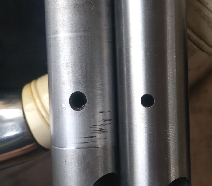 Vor dem Einbau habe ich die alte und die neue Welle mal nebeneinander gelegt, um zu prüfen, ob die Positionen der ÖL-Bohrungen des Nachbau-Teils denen des Original-Teils entsprechen. Ergebnis: Die Positionen stimmen.