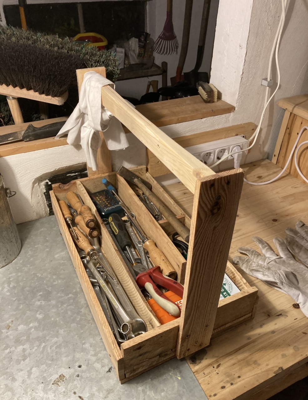 meine neu gebaute und jetzt beschickte Werzeug“Kiste“ in der aufgeräumten Garage - in Anschuss an das aufgeräumte Gartenabteil ...