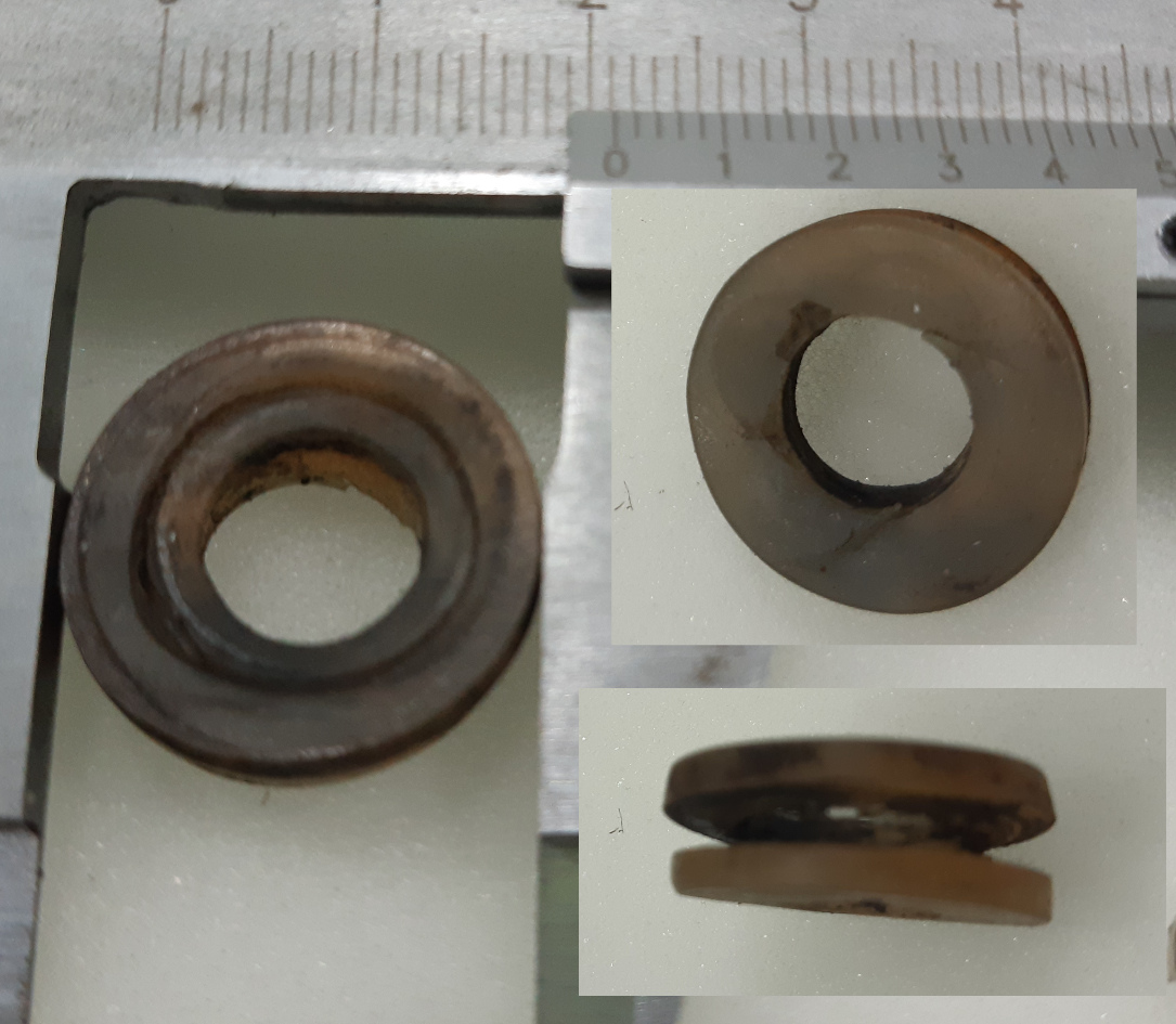 In dieser Gummitülle steckten bei mir Metallröhrchen mit einer "Krempe" auf der Motorseite. Den Eindruck dieser Krempe kann man auf dem Bild links, auf dem die Gummitülle auf der Motorseite zu sehen ist. Die Motorseite der Tülle ist deutlich dunkler wie die Aussenseite.