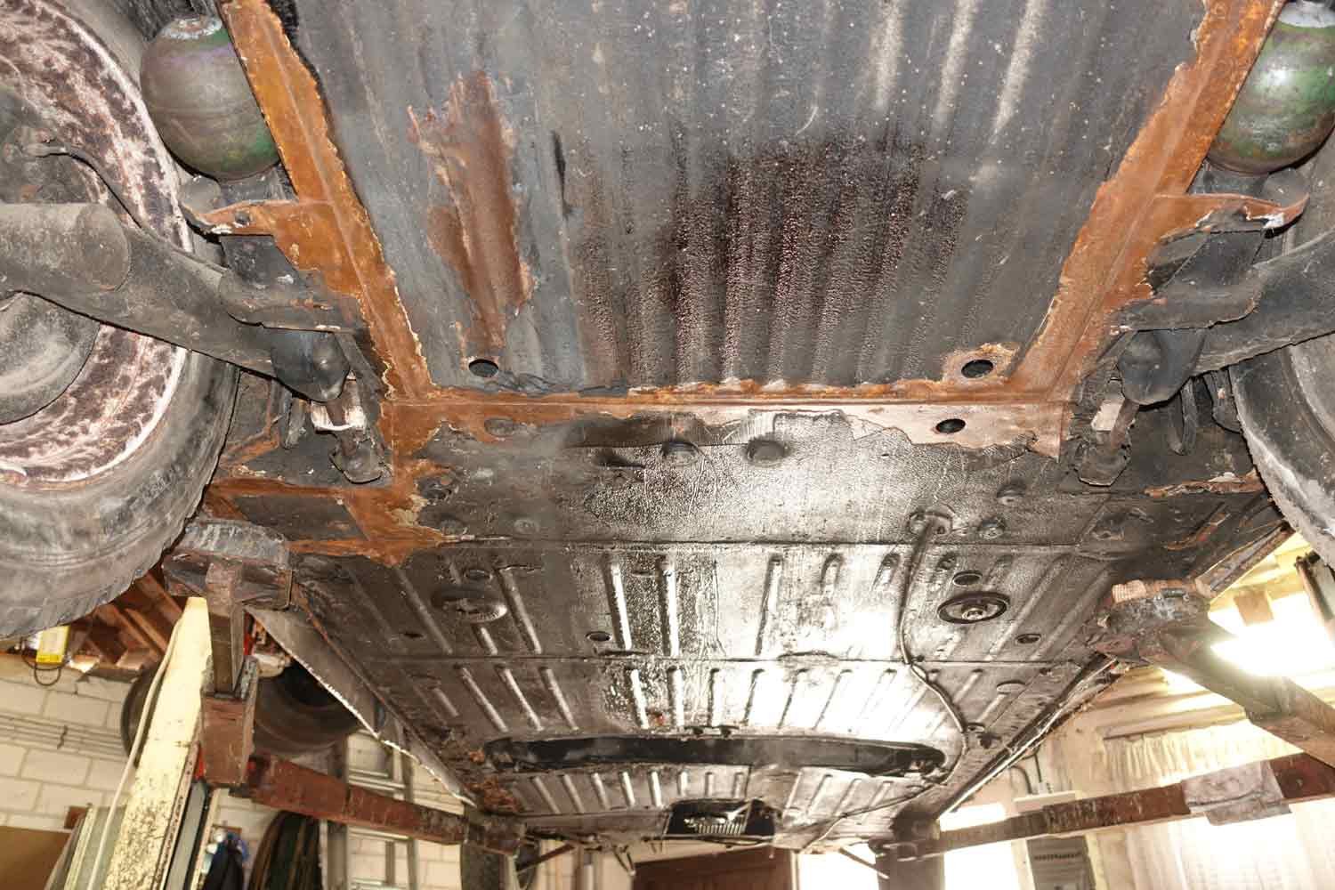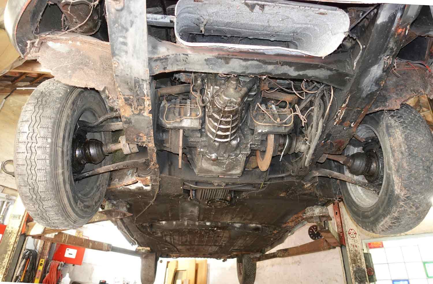 Die Substanz des Chassis ist in weiten Beteichen ganz ordentlich, die braunen Flächen oben sind nur unter dem losen Unterbodenschutz leicht angerostet