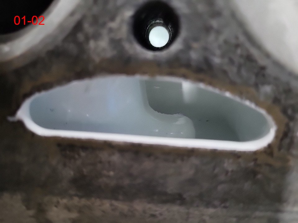 Aber besonders im Kühlkreislauf des Zylinderkopfes waren immer noch sehr große Ablagerungen zu sehen, die ich nicht entfernen konnte. Da der Zylinderkopf innen sehr verwinkelt ist, habe ich diesen Teil des Kühlkreislaufs ebenfalls mit Lack behandelt. Dazu habe ich - nach Rücksprache mit dem Korrosionsschutzdepot - Brantho Korrux 2-Kompo benutzt. Den Lack habe ich so verdünnt, dass er gut fließt und an alle Stellen rankommt. Hier ein kleines Bild wie es jetzt innen aussieht.