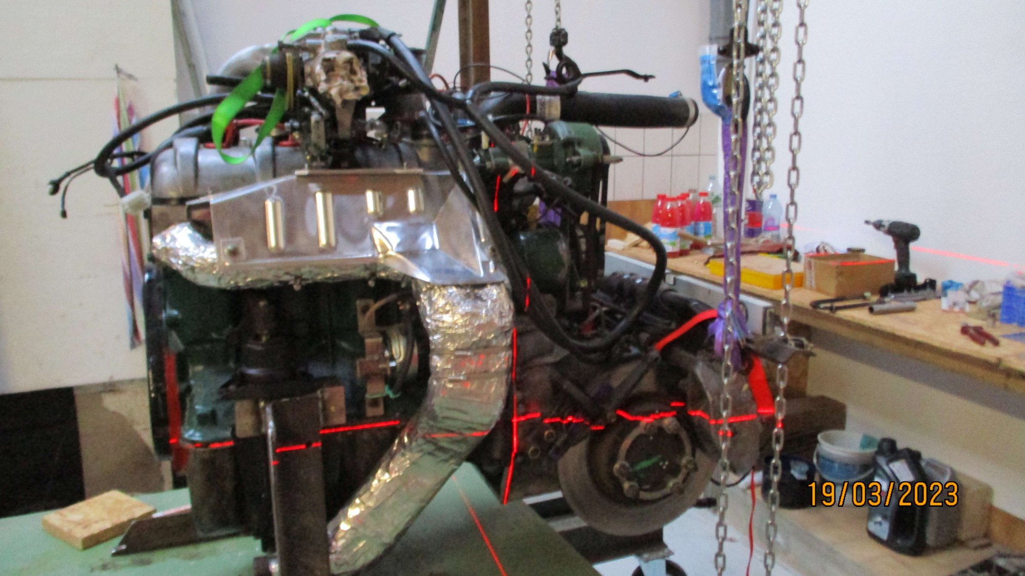 ich habe den Sonntag Nachmittag zu einer "Studie" am ausgebauten Motor meiner DS 23 i.E. genutzt. Ziel war es die (neuen) Motorlager korrekt einzustellen. Also frisch ans Werk; ein paar Stützen für die hinteren Lager aus Profilstahlkram zusammengeschweißt, die Getriebetraverse mit neuen Diabolos montiert, das ganze hinten auf die grob eingestellten Lager montiert und vorne an den Karosserieanschraubpunkten der Quertraverse jeweils links und rechts an einem eigenen Kettenzug aufgehängt. Ich ging davon aus, dass es während der Einstellung der hinteren Motorlager wichtig sei, den Motor sowohl in Längs- als auch in Querrichtung horizontal zu halten. In Querrichtung habe ich das mit einer Wasserwaage auf den Anschraubflächen für den Wasserkühler kontrolieret und in Längsrichtung mit einem Lasergerät, mit welchem ich die Trennfläche zwischen Motorblock und Ölwanne anvisiert habe. Nun konnte ich den Motor mit den Kettenzügen an der Quertraverse über dem Getriebe in Längs und Querrichtungen horizontal ausrichten. Schon dabei stellte ich fest, dass von den hinteren Motorlagern das Linke deutlich mehr belastet wurde als das Rechte. Nachdem ich dieses auf das im Handbuch genannten Einstellmaß (91mm) korrigiert hatte stellte ich sogar fest, dass die rechte hintere Stütze vom Gestell abhob. Sie erfuhr also überhaupt keinen Druck mehr. Das änderte sich erst, wenn man den Motor an der vorderen Quertraverse deutlich anhebt (ca. 2cm). Das sieht dann aber leider nicht mehr aus wie die Einbaulage im Fahrzeug... . Ich bin jetzt etwas ratlos und frage mich, ob es evtl. die bessere Alternative wäre, sich die Finger zu brechen und die Einstellung am eingebauten Motor durchzuführen. Man könnte evtl. den derzeitigen Meßaufbau dazu benutzen, um die horizontale Unterkante des Motors parallel als Linie auf das Hitzeschild zu übertragen und dann im eingebauten Zustand mit den Laser gut kontrolieren, ob der Motor in Fahrposition horizontal hängt. Ich gebe zu, dass meine recht theoretischen Betrachtungen evtl. den Bogen etwas. überspannen. Das liegt wohl daran, dass mir mit Madame DS die praktischen Erfahrungswert fehlen. Ich würde mich daher sehr über erhellende Kommentare zum Problem freuen.