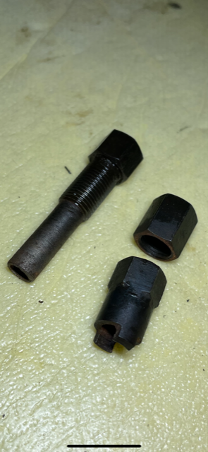 Mit dieser Methode ist die Konusmutter auch wiederverwendbar . Falls nicht, einfach aus einem runden Gewindeabstandsbolzen zwei Neue drehen. Das geht zur Not auch mit einer (Tisch-) Bohrmaschine.