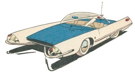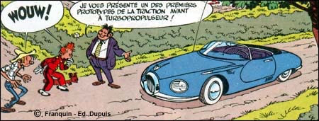Der Tourbot II von Franquin - mit ausgestellten Ecken, klar rechteckig - und mit an den Ecken platzierten Scheinwerfern.