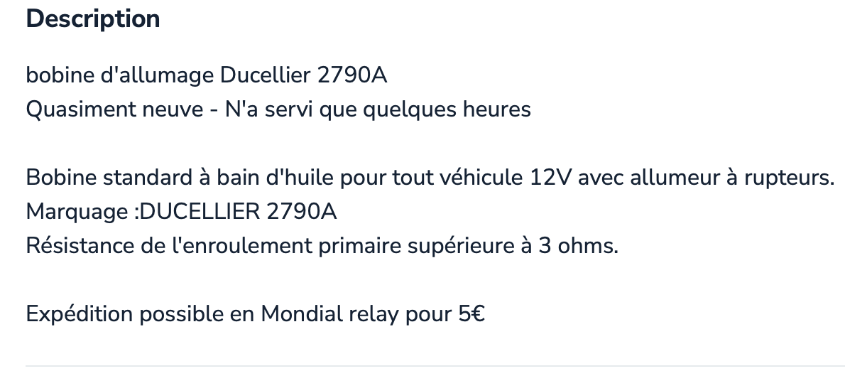 Ist eine 61er ID, eingebaute (originale vermutlich) Spule ist von Ducellier, bei den einschlägigen Zubehörhändlern finde ich ohne Vorwiderstand zwei Angebote: der "Franzose" (Valeo) und D. Sassen, dort ist die Spule auf dem Foto zumindest identisch mit der bei mir eingebauten - habe ich also bestellt, geliefert wurde ebenfalls eine Valeo - allerdings ein anderer Typ als "der Franzose" anbietet.