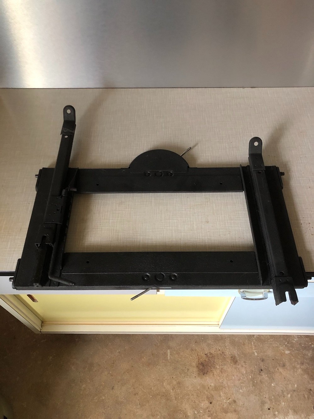 durch die lange Lagerung und diverse Umzüge sind mutmaßlich die Hebelchengestänge für die Höhenverstellung verbogen (hier eine meiner Sitzschienen)? Kann mir jemand sagen, ob die "geradeheraus" aus ihrem Drehpunkt bis zum Knaufgewinde verlaufen? Oder gehört (zumindest) der vordere nach oben ("gegen den Sitz) gebogen?