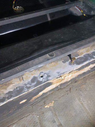Als vor über 20 Jahren das Fahrzeug vom Karosseriebauer zurück kam (er hatte das Heck zusammengeschweißt) lag da über dem Tank eine ziemlich dicke Eisenplatte, an deren vorderen Enden ziemlich grob Ausschnitte hineingeflext worden sind. Auch diese dicke Abdeckung ist nicht verschraubt, sollte es aber meiner Meinung nach sein, vielleicht sind dazu die Aussparungen gemacht worden.