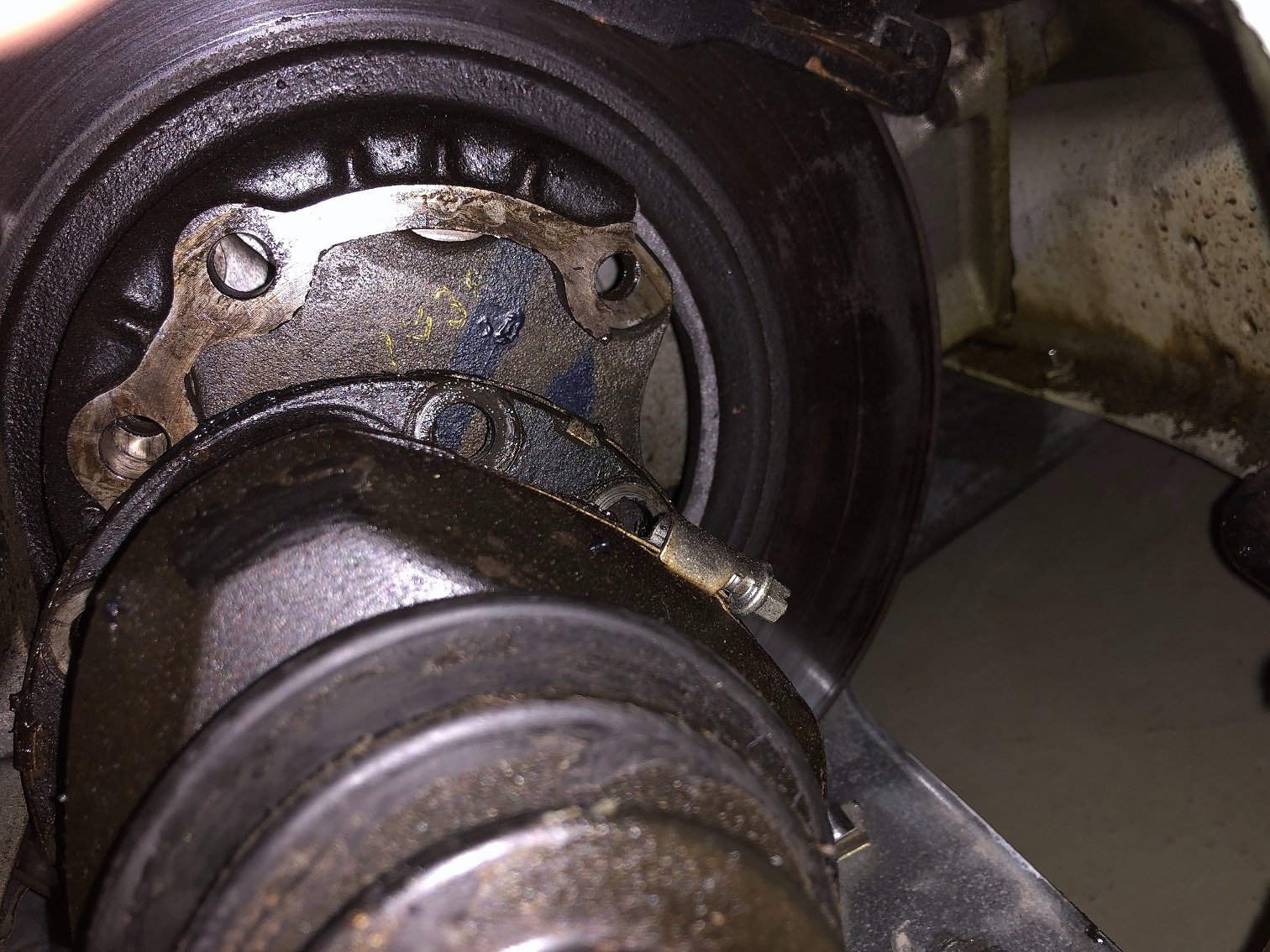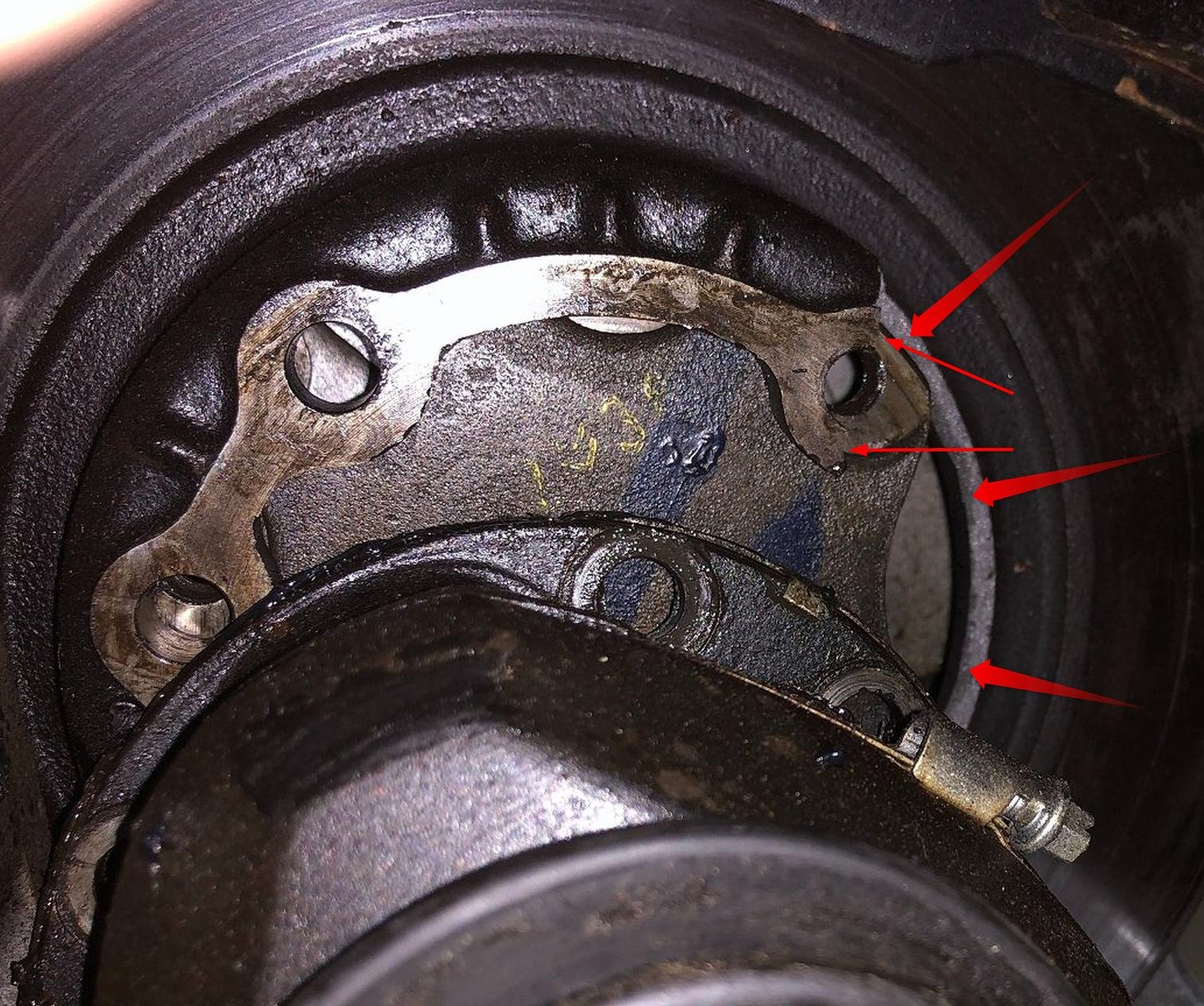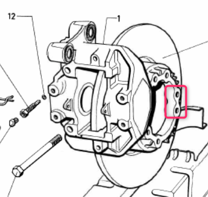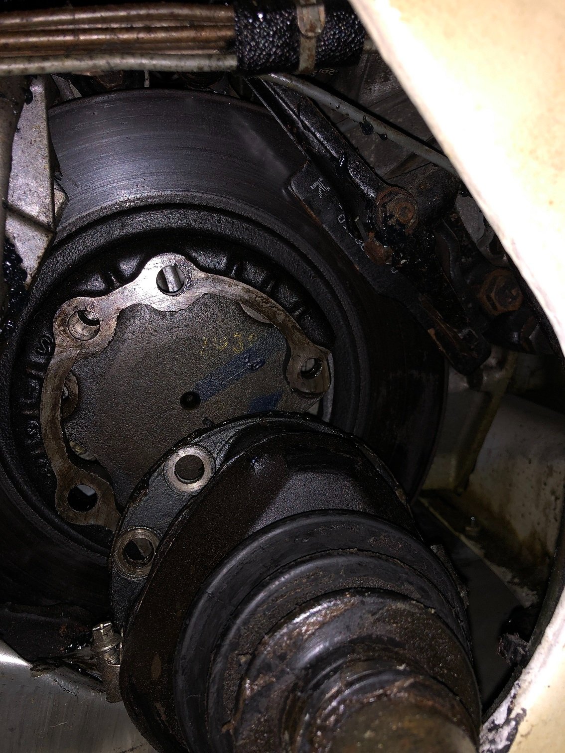 Nach ca. 10 minuten studieren auf den Bilder bin ich mir ziemlich zu sehen dass ein Stück von der Bremsscheibe abgebrochen ist, und zwar ein Stück um mindestens einer der 6 Befestigungslöcher.