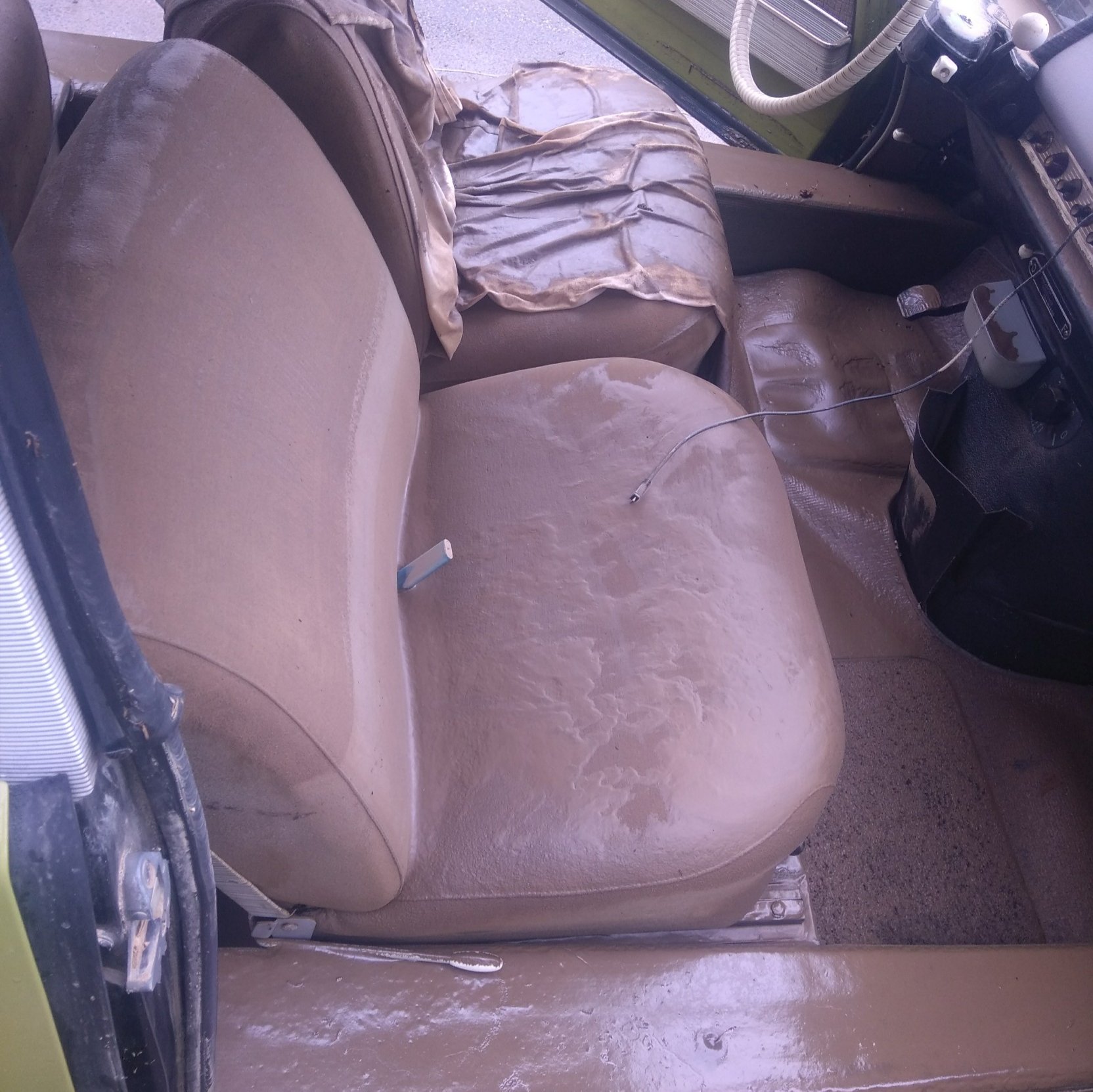 So sahen die Sitze meiner Eule vor 4 Jahren direkt nach der Flut aus. Und obwohl der Schlamm fast den Farbton brun isard hatte, hab ich die Bezüge damals abziehen und waschen lassen.