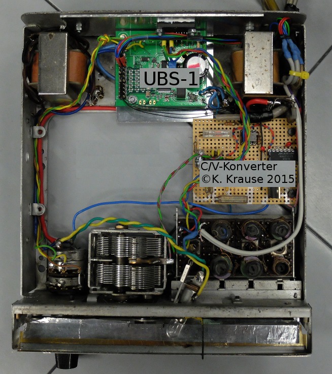 In den letzten Monaten habe ich dann die Idee gehabt, einen C/V-Wandler zu bauen, das ist eine elektronische Schaltung die die Kapazität des originalen Abstimmkondensators im Bereich von 10pF bis 660pF in eine proportionale Spannung umsetzt. Der Prototyp ist auf der kleinen Lochrasterplatine aufgebaut. Der Vorteil des Ganzen ist, dass es auf praktisch alle Radios mit DrehKo-Abstimmung angewandt werden kann, ohne dass Mechanikgepfriemel angesagt ist.