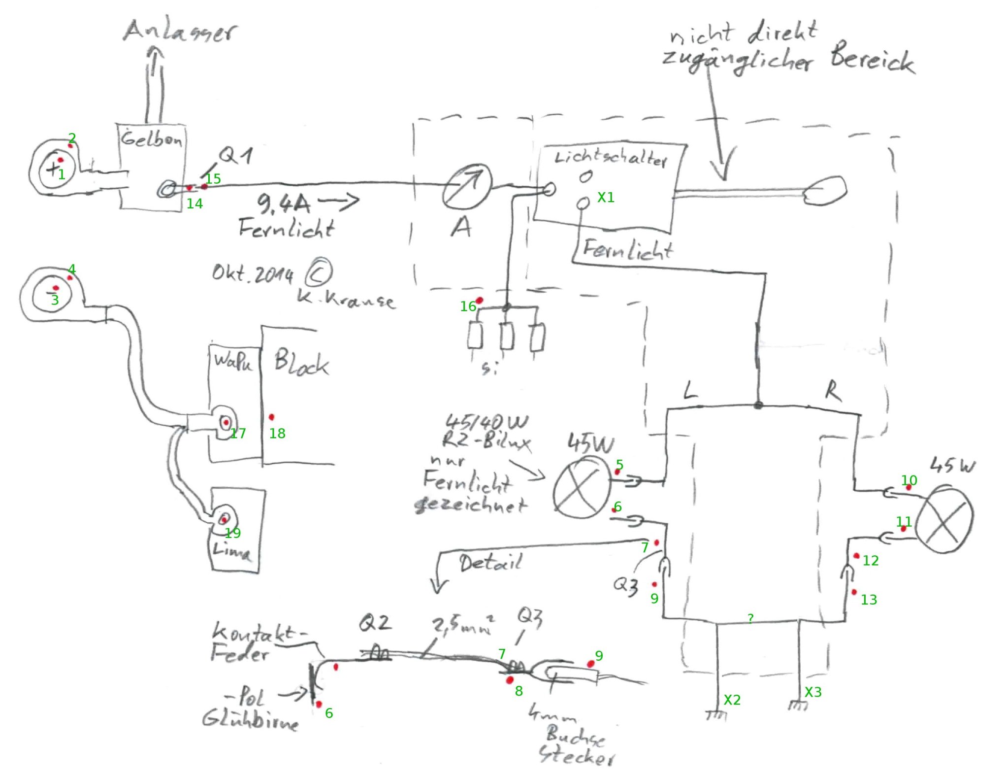 Die 9,4A sind plausibel: 2*45W Scheinwerfer + 4*5W hinten + 2*2W Standlicht vorne + 4W Armaturenbrett = 118W. Das passt im Rahmen der interessierenden Meßgenauigkeit.