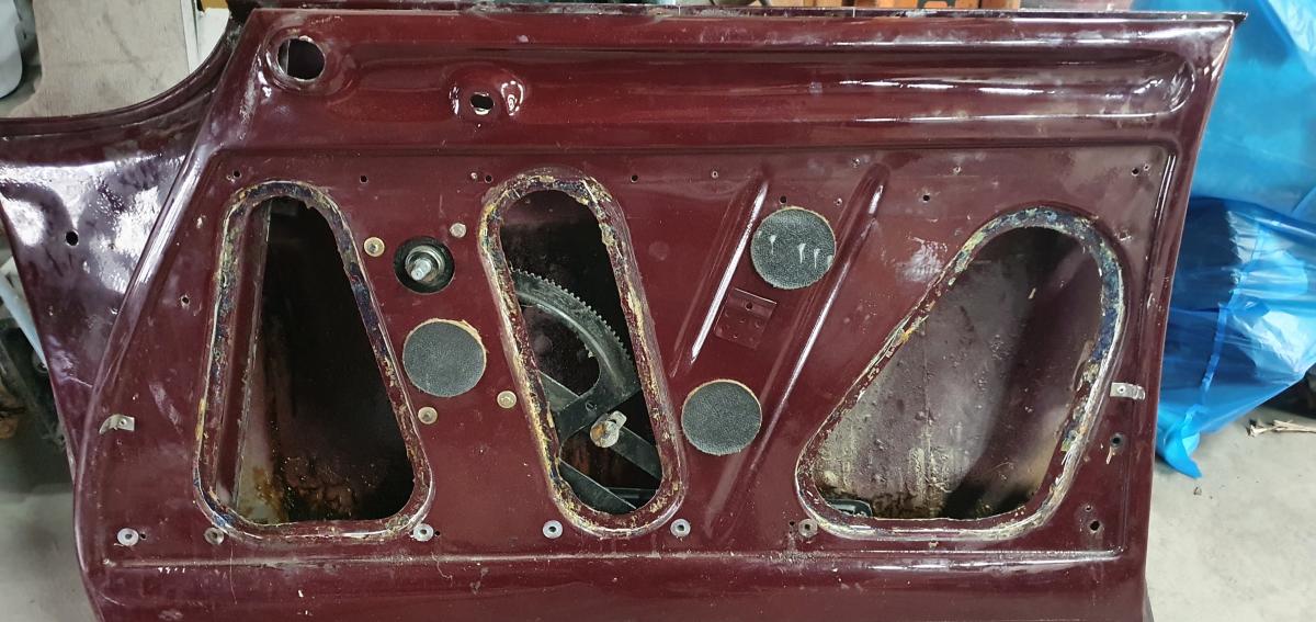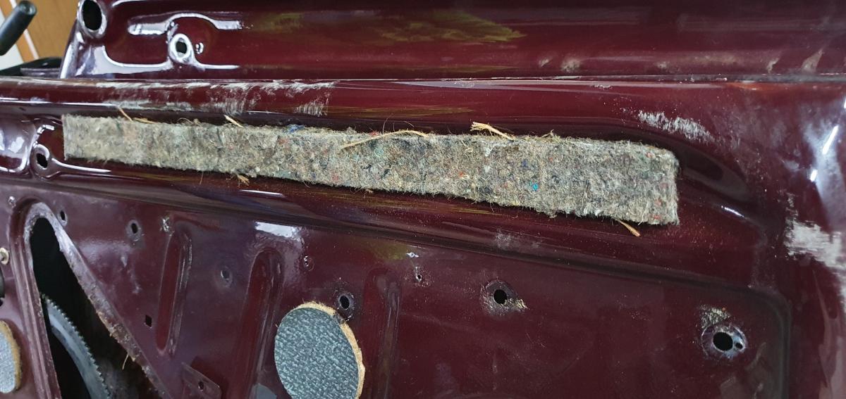 jetzt bin ich mit Fotos zurück. Da mein Wagen damals lackiert wurde, wurden offensichtlich teilweise keine Schaumstoffe mehr aufgeklebt. Man kann sehen, daß nur diese eine Tür diese Schaumstoffreste hat. Sie sind aber zu flach für die Mulde. Die Mulde ist bei mir knapp 10mm, die Schaumstoffreste nur 5mm.