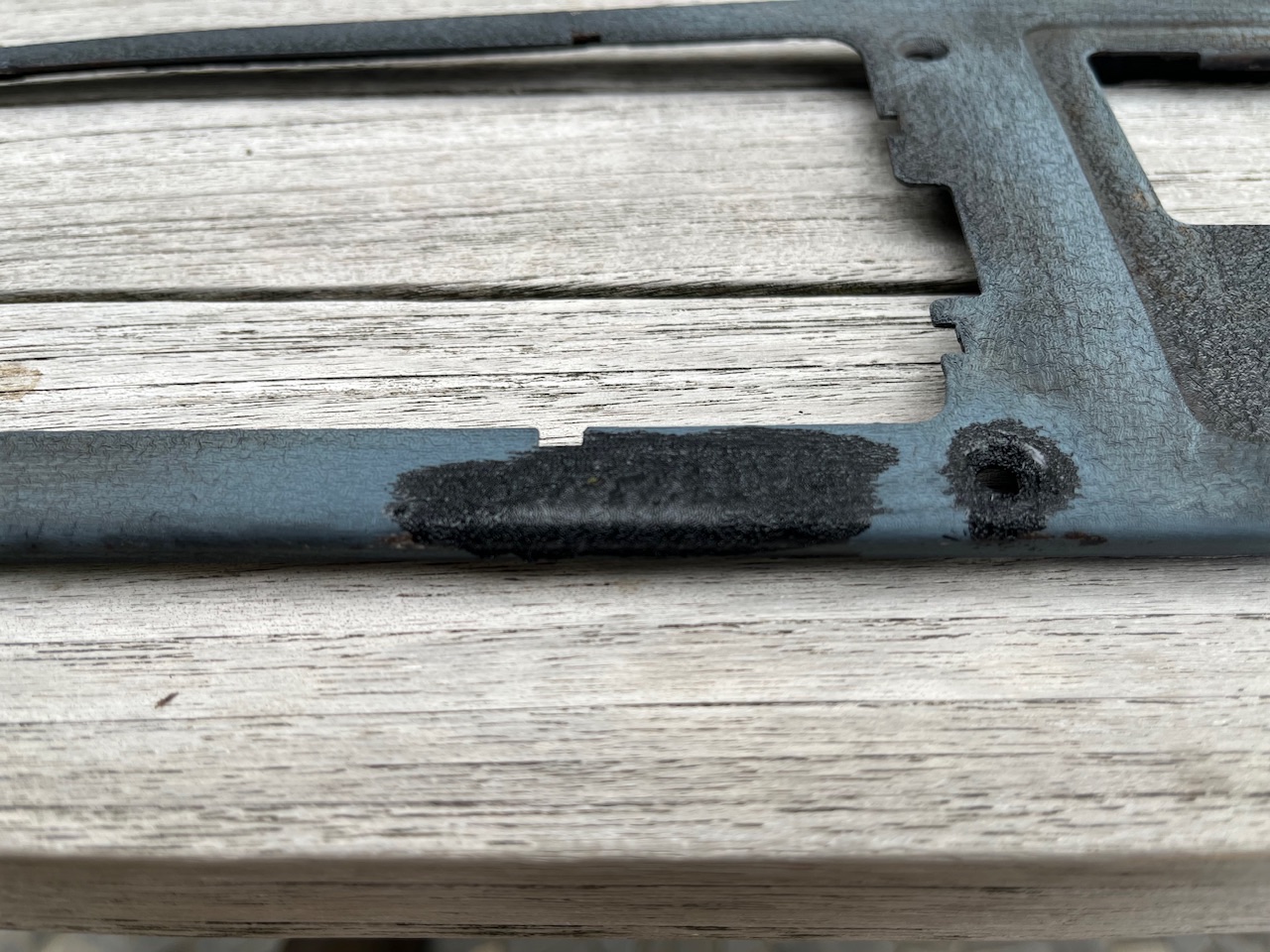 Normalerweise ist loser Rost nach so einer Behandlung problemlos (nach 24 Std.) abzuwaschen … bei Schrumpflack nicht! Der Lack bildet mit dem Rost eine haftende (unschöne) Schicht. Ich habe dieses Amalgan mit einen Einwegskalpell vorsichtig bis aus blanke Metall entfernt.