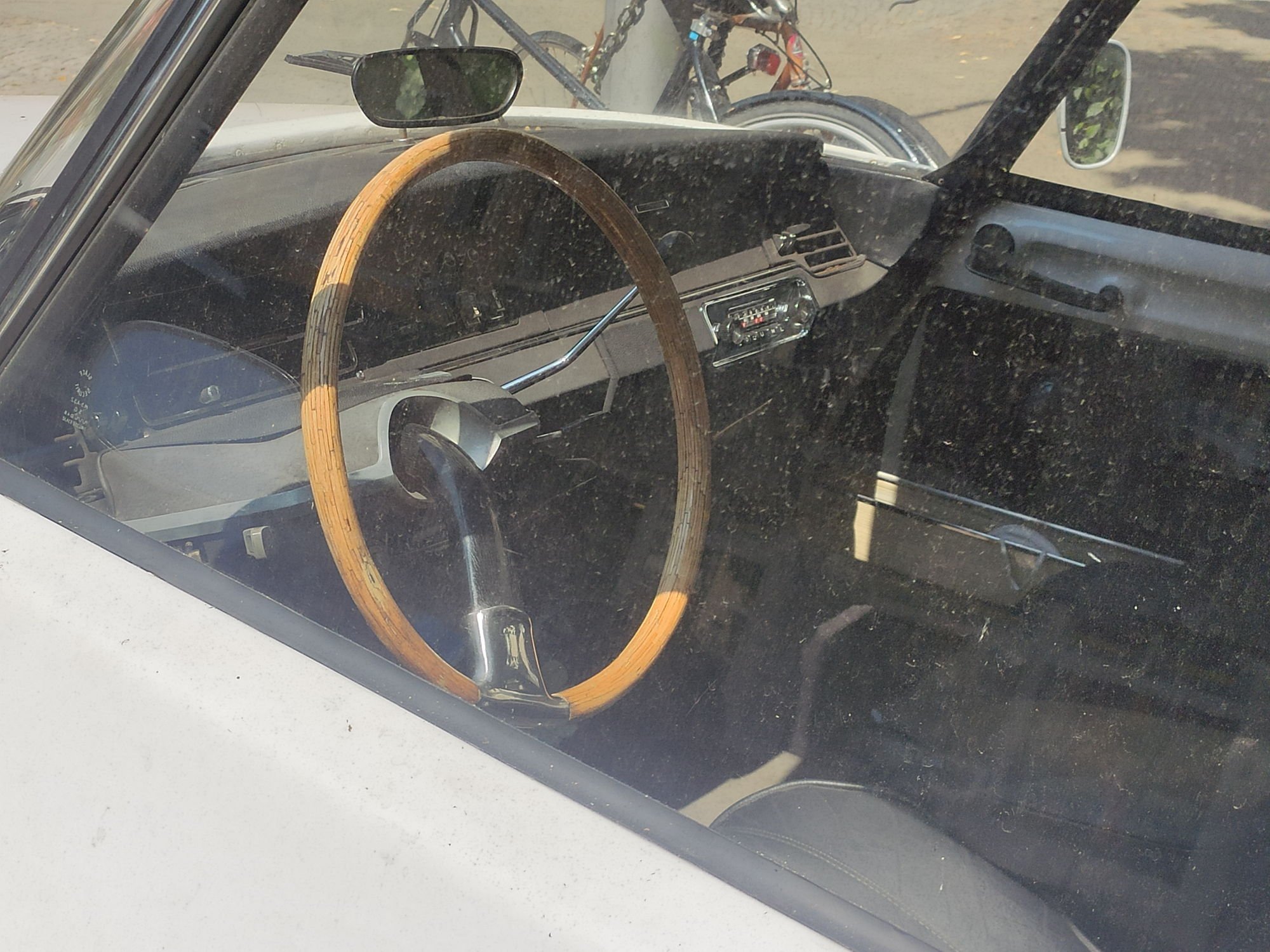 Eine weiße 69er mit einem bemerkenswerten Lenkrad. Hat jemand so etwas schon mal gesehen? Oder gar hergestellt? Als Holzhandwerker fühle ich mich natürlich gleich heraus gefordert und beginne sofort über die Vorgehensweise nachzudenken. Ist auf jeden Fall eine Herausforderung. Was mich wundert, sind die relativ kurzen Lamellen und die daraus resultierenden vielen Stöße. Das müsste auch anders gehen. Aber dennoch ein sehr respektables Ergebnis.