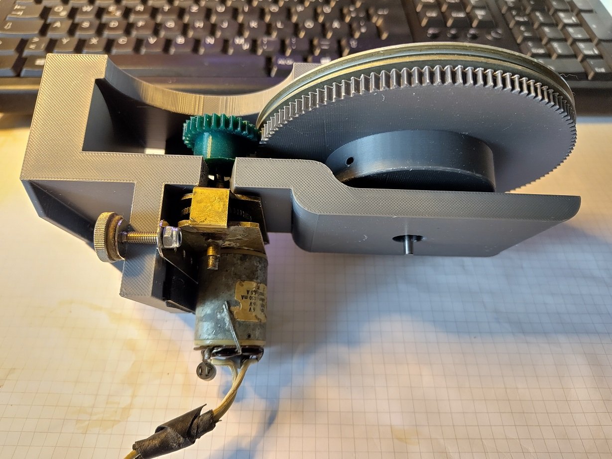 Die Rolle auf dem Zahnrad stammt übrigens aus einem 60er Jahre Tonbandgerät, das Getriebe mit dem Motor war der Schotantrieb aus einem Modell-Segelboot ... (=Direktrecycling)
