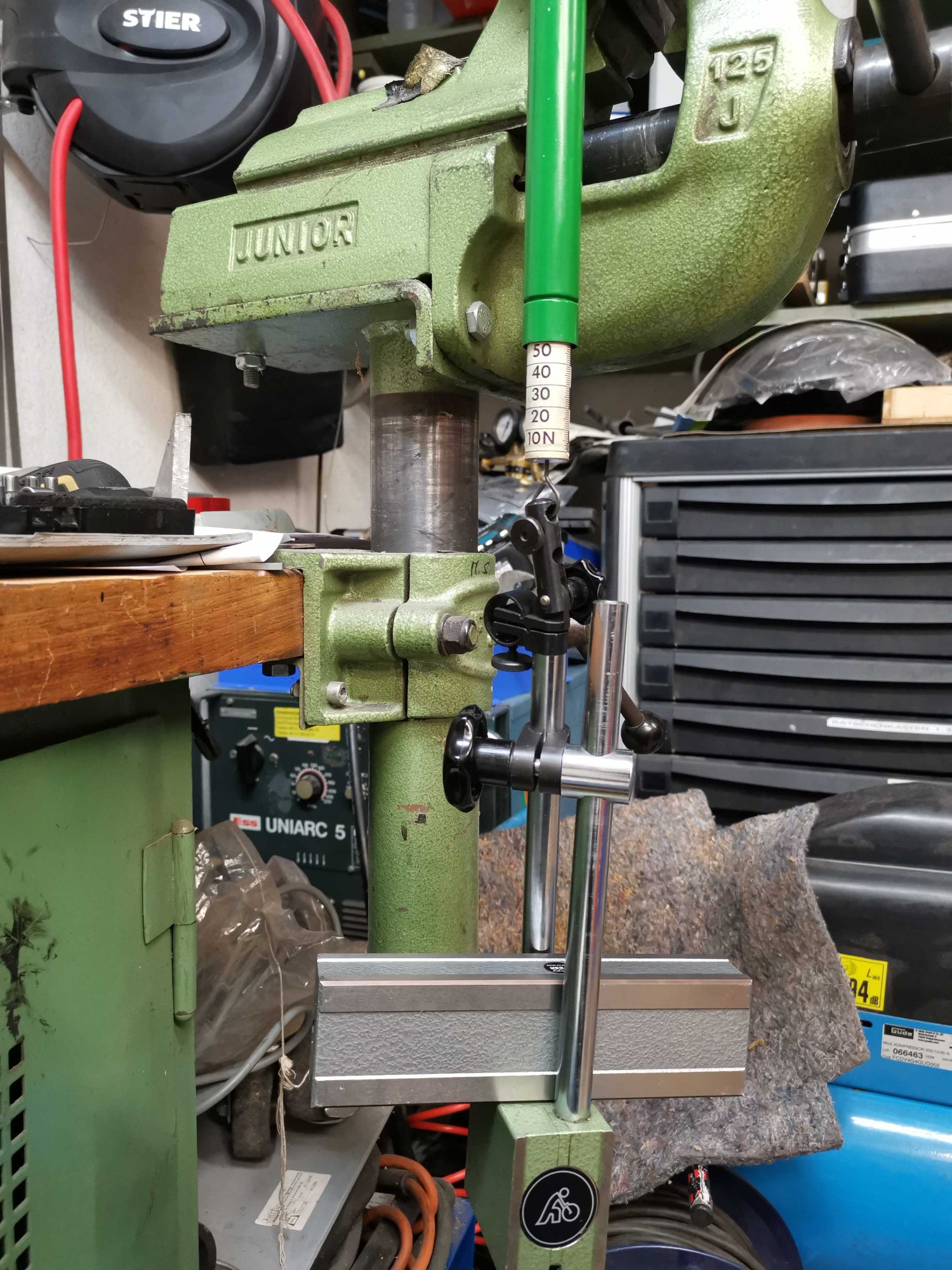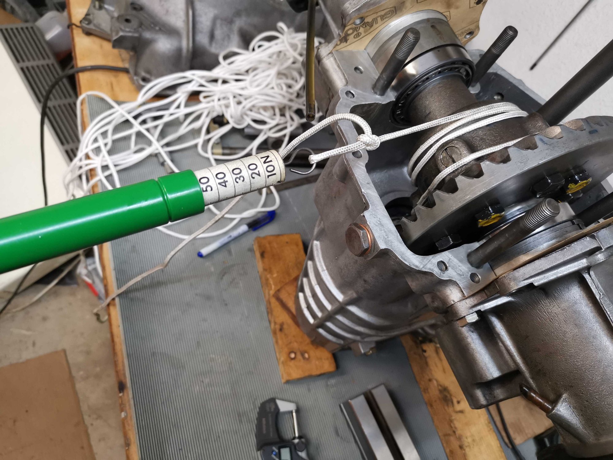 Immerhin ist die Lagerspannung fürs Differentiallager fertig. Gemessen 0,35 mm und mit Federwaage 5 kg kontrolliert. Ein erstes Einsetzen für das Flankenspiel ergab zufällig 0,2 mm. Nun das eigentliche Problem