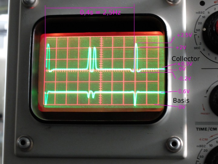 Die obere Kurve zeigt die Spannung am Kollektor, man kann die Schwingungsdauer des Antriebs von 0,4 Sekunden oder 2,5Hz ablesen. Die hohen Spitzen sind die Zeiten, in der der Transistor sperrt, im Rest der Zeit ist er durchgeschaltet. Interessant ist, dass jede Periode 3 Spitzen enthält: Zwei nahe beieinander liegende und eine Einzelne. Direkt nach dem Durchschalten des Transistors geht die Kollektorspannung sogar kurz ganz auf 0, also unter diie Sättigungsspannung von 0,3V an der Emitter-Kollektor-Strecke.
