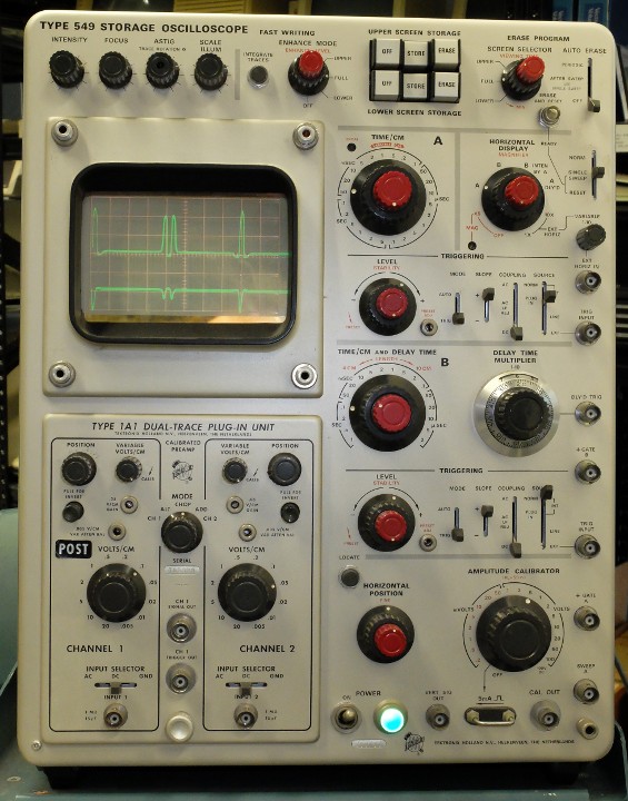 Hier kann man die Einstellung des Oszis, ein TEK 549 Speicheroszilloskop, Baujahr 1965, ca 100 Röhren, 1kW Leistungsaufnahme sehen: