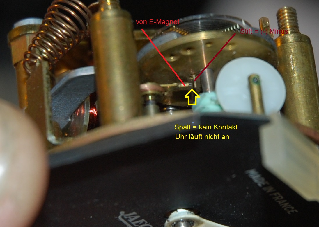 Funktion ist deutlich einfacher: Die Unruhe schließt mit einem kleinen Stift den Stromkreis, der Magnet zieht an und unterbricht dadurch den Stromkreis wieder und die Unruhe schwingt. Bei jedem Nulldurchgang neuer Stromfluss usw.
