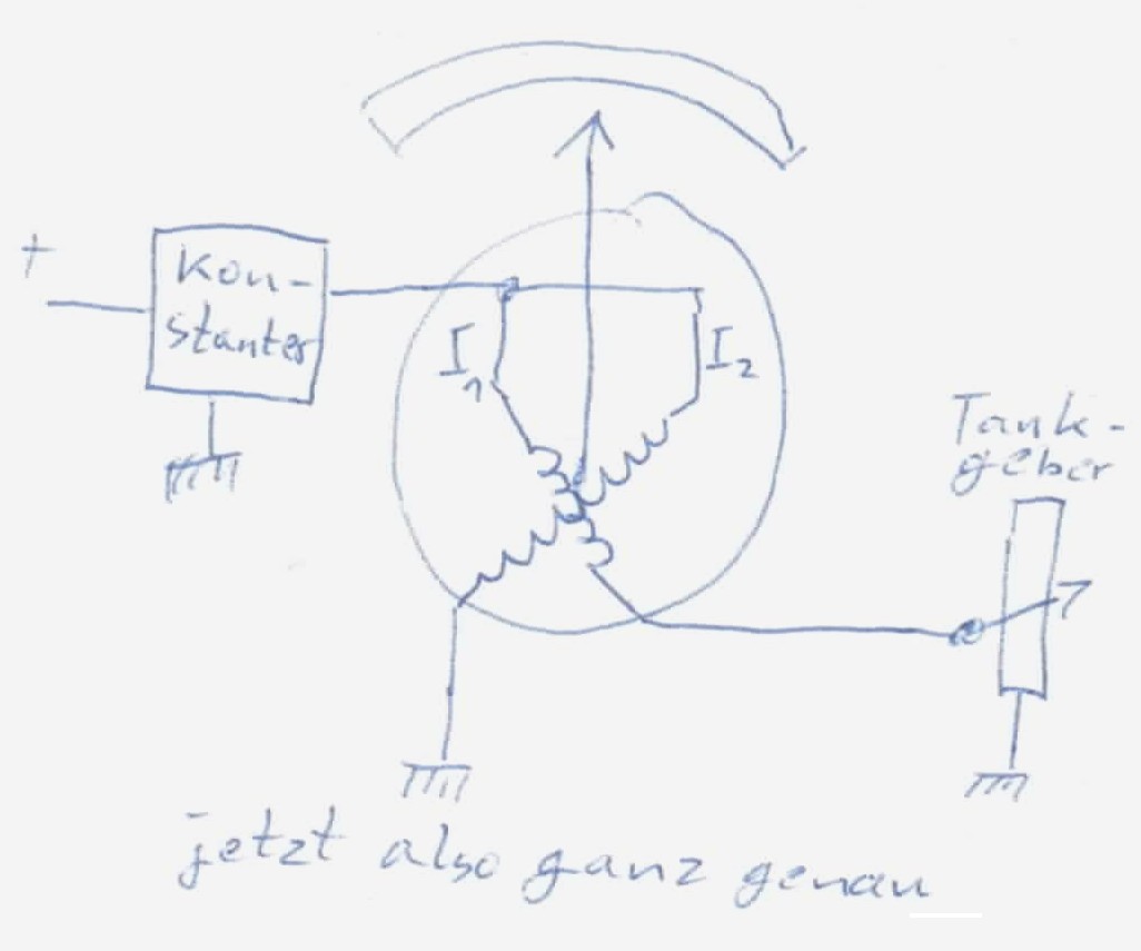 Der Strom I[sub]1[/sub] muss zusätzlich durch den Widerstand des Tankgebers fliessen, er ist somit