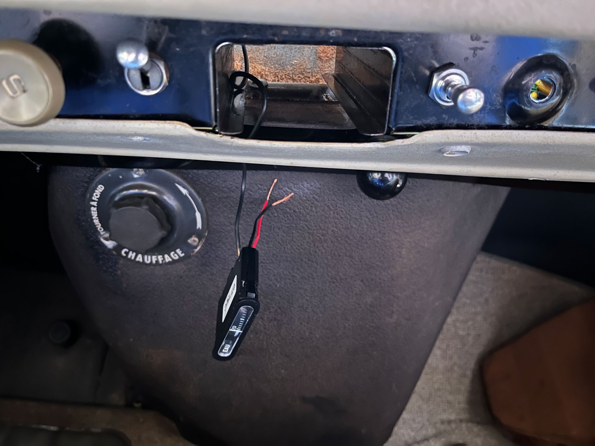 Das Thermometer an sich sitzt an originalen Befestigungspunkten am Unterteil der Instrumententafel auf einem geschwärzten Stück Hartfaserplatte und ist mit einer 1,2W Glassockelleuchte versehen, um auch nachts ablesbar zu sein.Diese Leuchte wird über den Lichtschalter aktiviert.