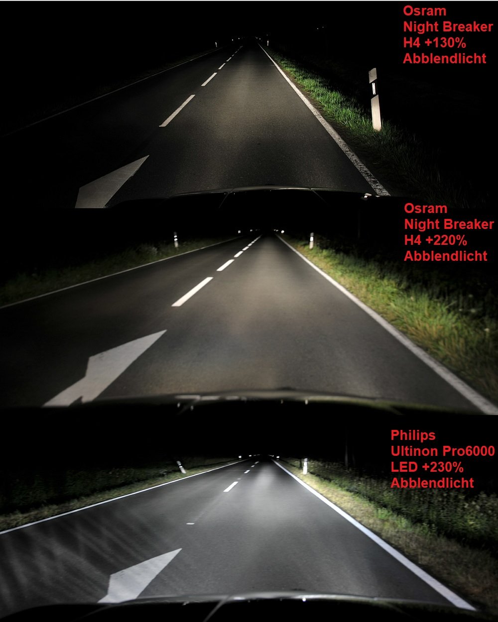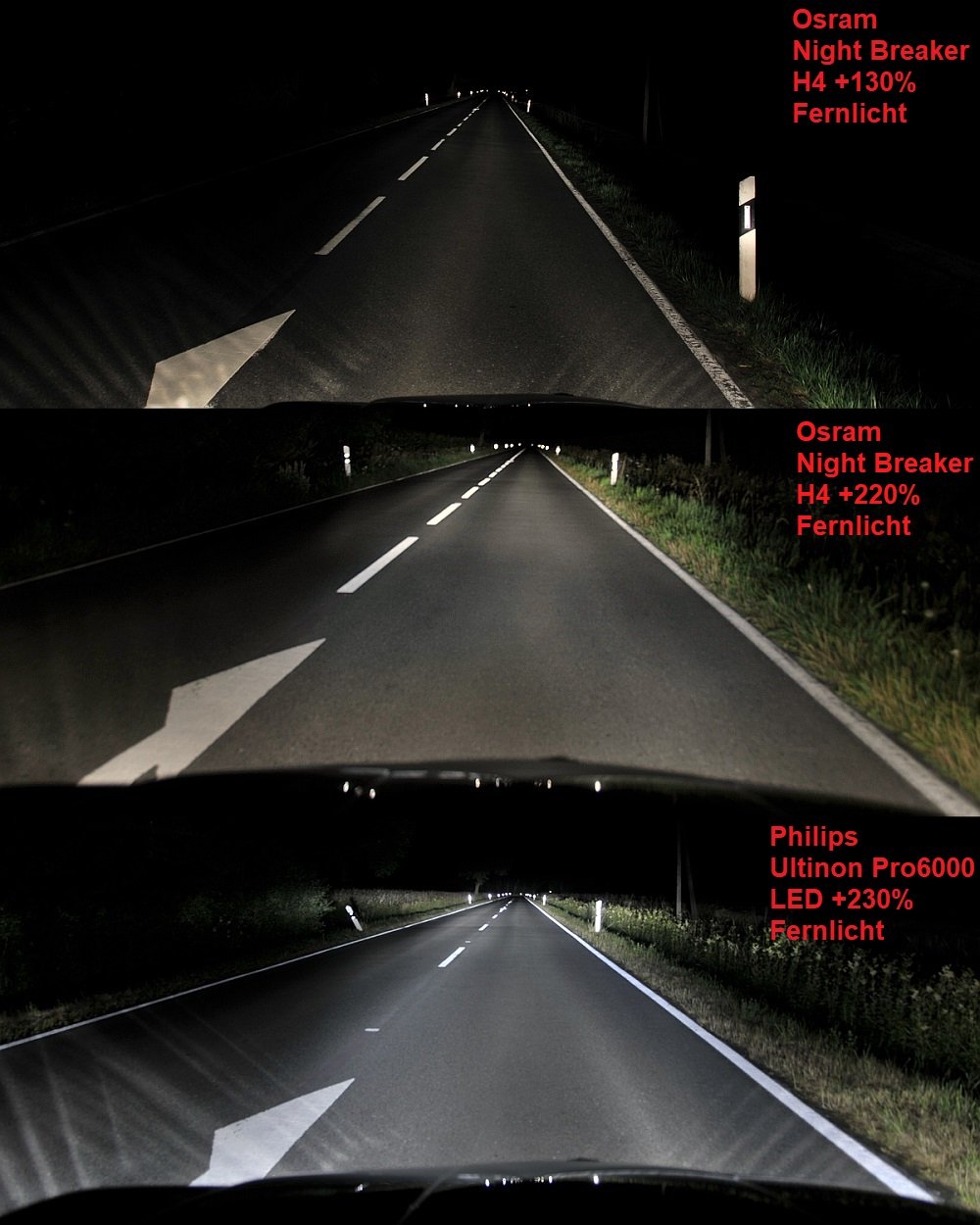 Ca. um 2022 rüstete ich auf Osram Nightbreaker +220% um und wie auf den Vergleichbildern zu sehen ist, ein großer Sprung gegenüber den +130% und schon ziemlich nahe an den LED's mit +230%.