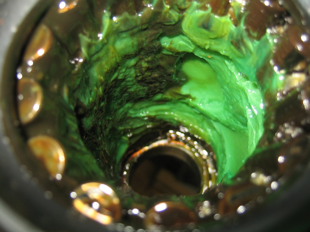 Das zusätzliche Fett, ungefähr in der Mitte zwischen den Lagern eingebracht, hat sich recht gut verteilt (grünes LMX). Aber im Bereich der Lager selber ist immer noch v.a. braunes öliges Zeug vorhanden.
