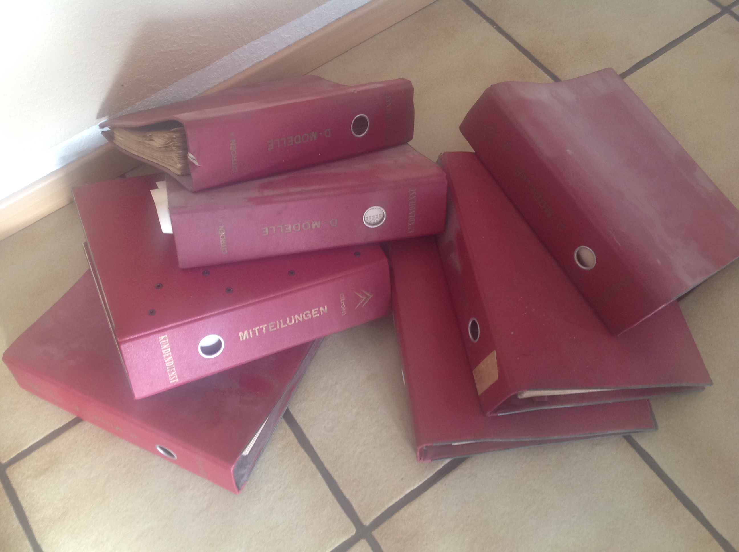 Ich habe 7 Originale Citroën Ordner mit technischen Mitteilungen. Sehrwahrscheinlich habe ich diese von verschiedenen Citroën Händler, aber je nach dem wie fleißig die damals neue Mitteilungen eingeheftet haben , fehlt in irgendeinen von 7 Ordner etwas.