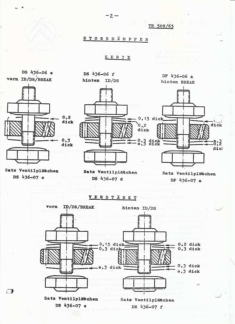 In der Technische Mitteilung TR 509/65 von Januar 1965 (siehe hier unten) sind zwei verschieden ausgelegte Dämpfer abgebildet, die normale, das ist DS 436-06e, und eine verstärkte Variante. Die Dämpfer die bis heute in der vordere Federkugeln meine DS eingebaut waren entsprechen die verstärkte Variante (ich habe die Dicke der Dämpferplättchen nachgemessen).