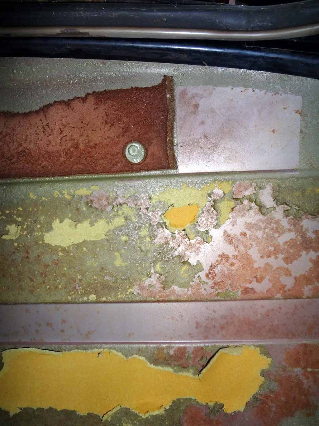Dachträger mit 6-Kantschrauben. Die roten Schaumstoffreste entsprechen den Zusatzstreifen, die gelben sind Dachhimmelrückseite