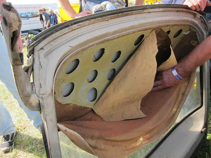 Und weiter hinten: bei den Heckklappen finden sich bei den meisten Breaks dunkle Verfärbungen im Oberteil, die den darunter liegenden Löchern entsprechen, weil der Himmel auch hier direkt verklebt ist (vielleicht zieht hier quasi zwangsentlüftet Luft durch?). In Lipsheim habe ich jedoch eine augenscheinlich originale Klappe gesehn, die eine Zwischenlage hatte.