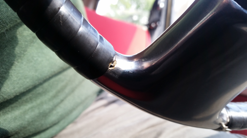 Unter dem Lenkradband keinen Kleber verwenden, falls die gris rose-Lackierung zu stark abgeblaettert ist, wuerde ich mit dem Pinsel ausbessern. Auf lackiertem Untergrund haftet das Lenkradband viel besser, als auf metallisch blanken Stellen, wo es nachher bei kraeftigen Lenkbewegungen verrutschen kann.