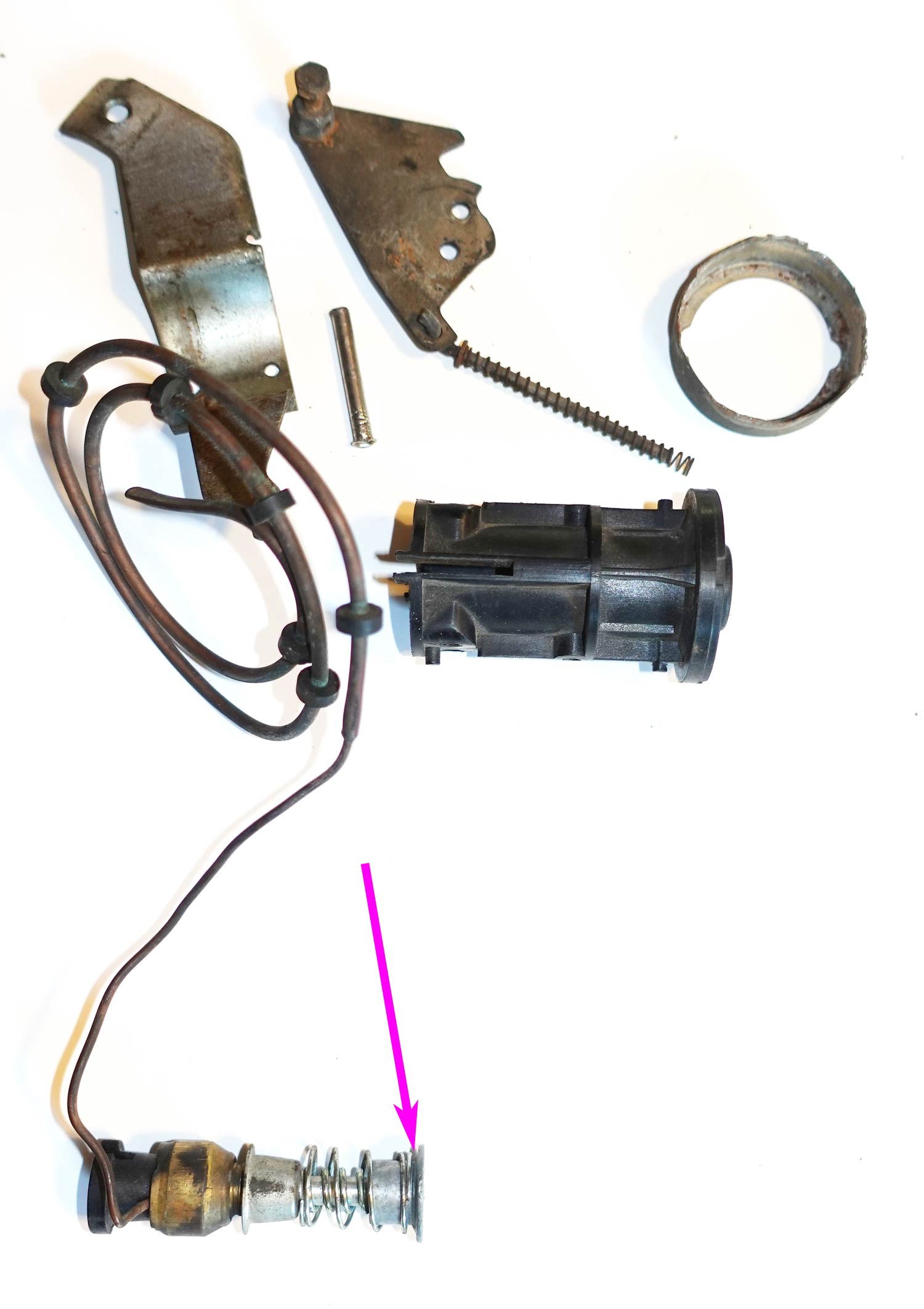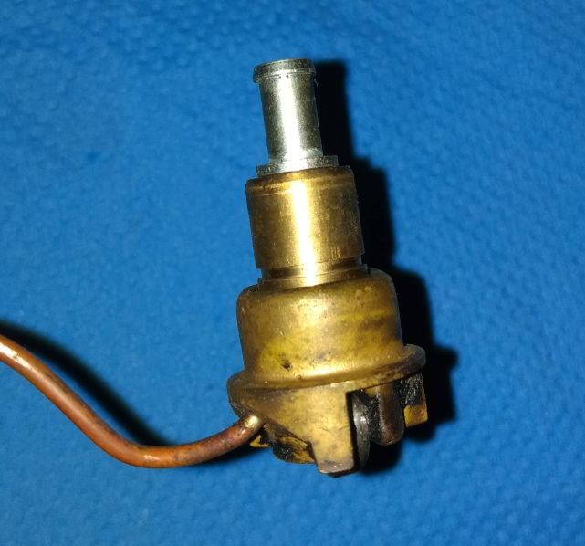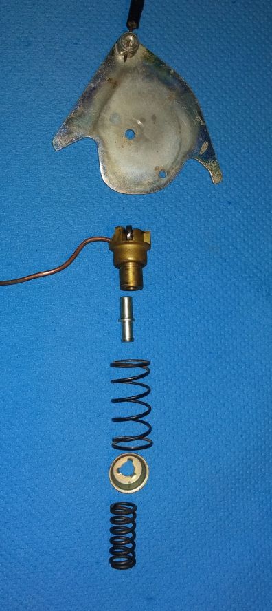 Das Thermoelement trägt einen Stößel, der Bund dieses Stößels drückt nach unten gegen die Federtellerscheibe, die wiederum drückt nach unten auf die Oberseite der unteren Feder (kleinerer Durchmesser), die ihrerseits unten gegen den Gummiteller drückt, der das Ventil bildet. der Teller hat eine Nut zur Aufnahme dieser Feder.