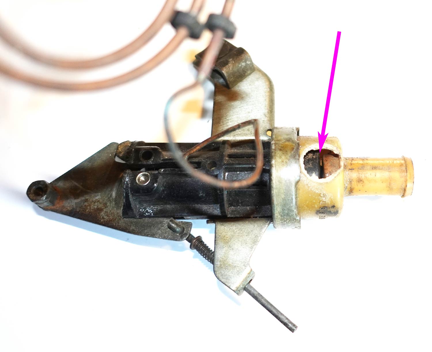 der Pfeil zeigt auf den offenen Ventilspalt. Ein typischer Schaden ist der abgebrochene Flansch zum Heizungswärmetauscher.