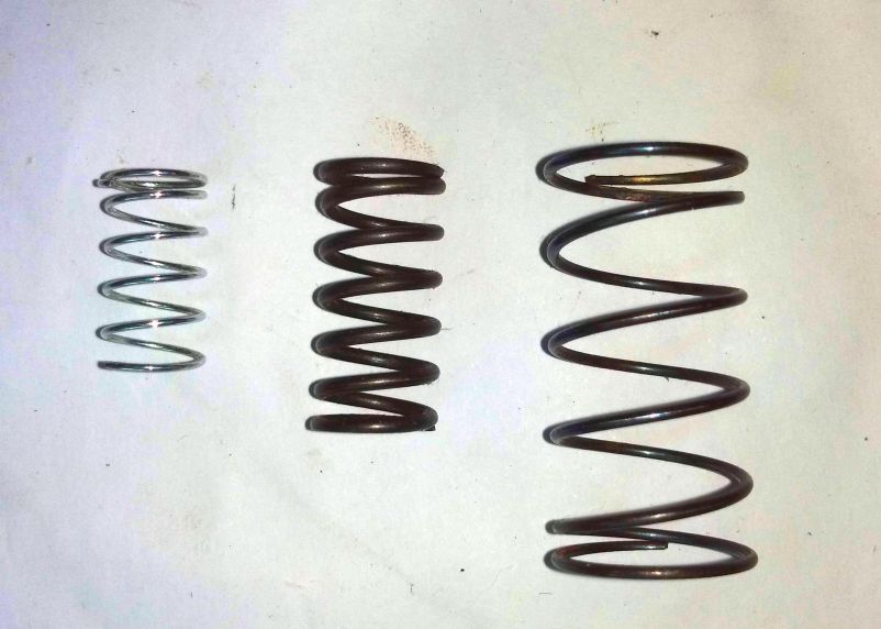 Ich habe jetzt bei meinem SM-Ventil eine schwächere Feder eingesetzt (die silberne links), damit macht das Ventil sauber auf und zu und ich habe eine Regelung über den gesamten Bereich des Schiebers (von ganz rot bis ganz blau).