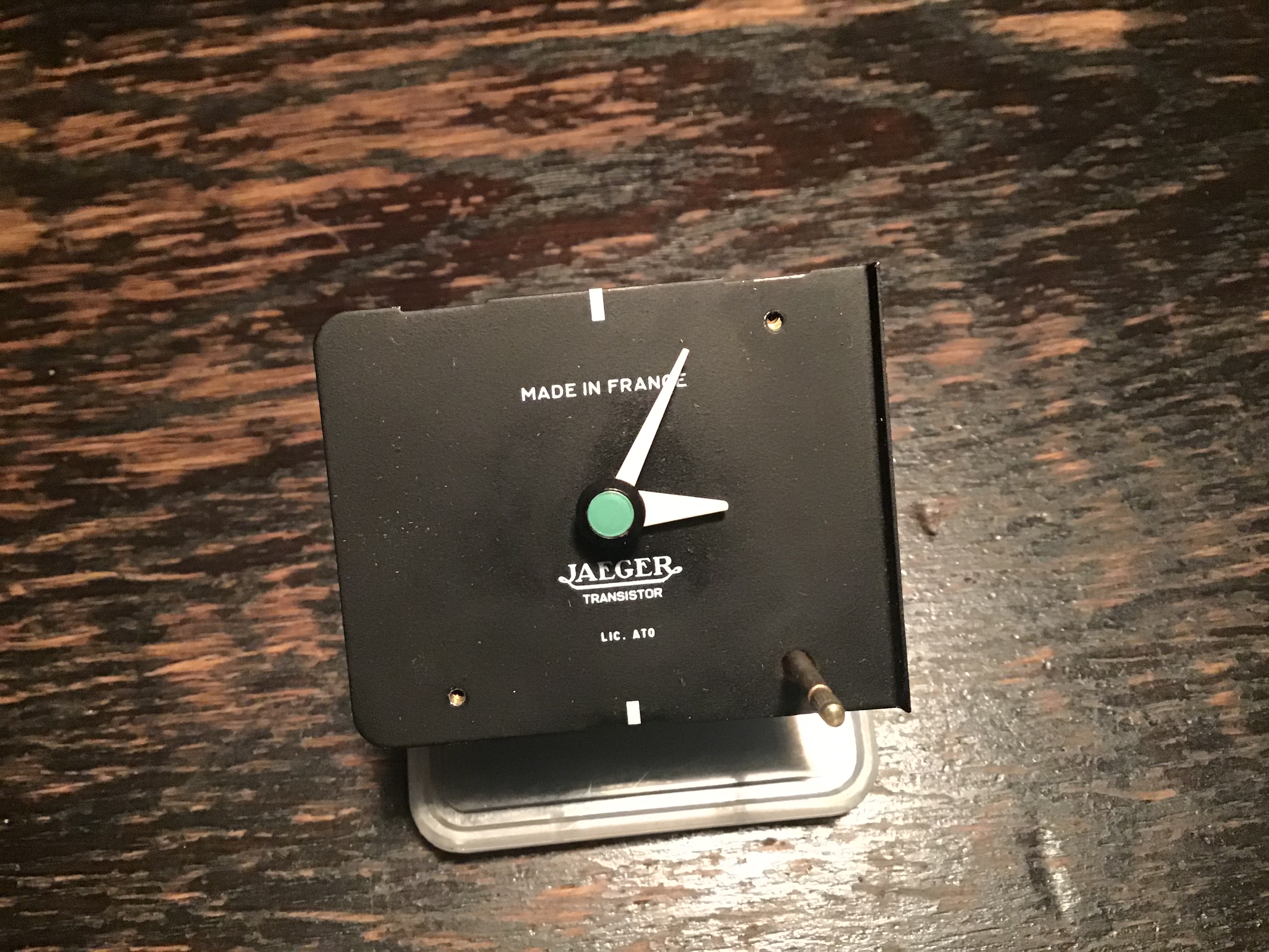 Da habe ich nun nach Vlados Hinweis das Lager der Hauptwelle entfettet und geölt. Das Uhrwerk läuft jetzt an der Autobatterie auf die Minute genau. Heute habe ich mich an den Zusammenbau gemacht und bin gleich gescheitert. Ich kann einfach die beiden kleinen Schräubchen, mit denen das Ziffernblatt (also das Blech, auf dem „Jaeger“ steht“, s. Bild) angeschraubt wird, nicht wiederfinden. Peinlich. Eigentlich habe ich alle Teile sorgfältig in einer Blechschachtel aufbewahrt. Ich kann mich aber einfach nicht mehr an diese zwei Schräubchen erinnern. Und trotz aller Sucherei habe ich keinen passenden Ersatz gefunden. Die sind mit max. 1,2 mm Durchmesser auch wirklich winzig. Deshalb zur Frage: Hat jemand von Euch aus einer nicht mehr intakten Uhr Ersatz für mich? Würde meiner Uhr, dem Auto und mir total helfen. Danke schon mal!