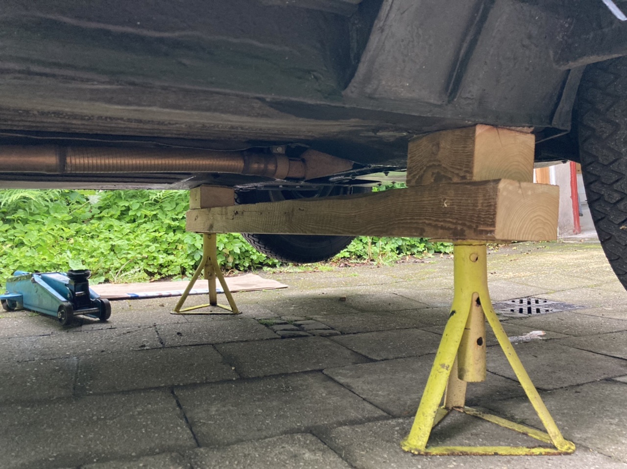 Das hätte ich mit vor Jahren bauen sollen - mit einem einfachen Hydraulikwagenheber jetzt ganz einfach und flott aufzubocken, da man mit dem Heber unter den Balken geht! Die Klötze sind mit versenkten Spaxschrauben fest montiert - oben sind sie mit Karosseriefilz „gepolstert“.
