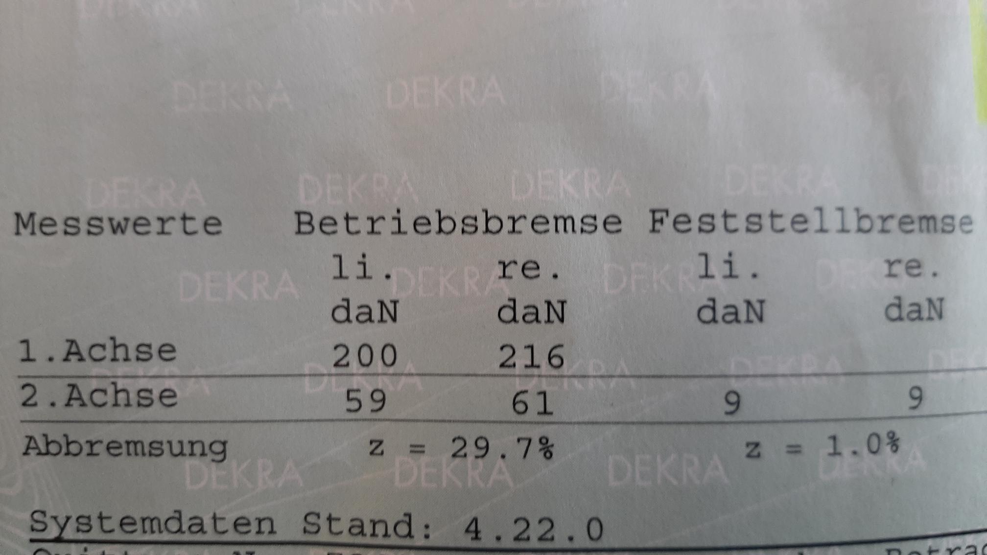 Wenn ich die Richtlinien richtig verstanden habe, müsste die Gesamtbremskraft ja 50% der zulässigen Gesamtmasse erreichen also ca. 900daN oder die Räder müssen blockieren.