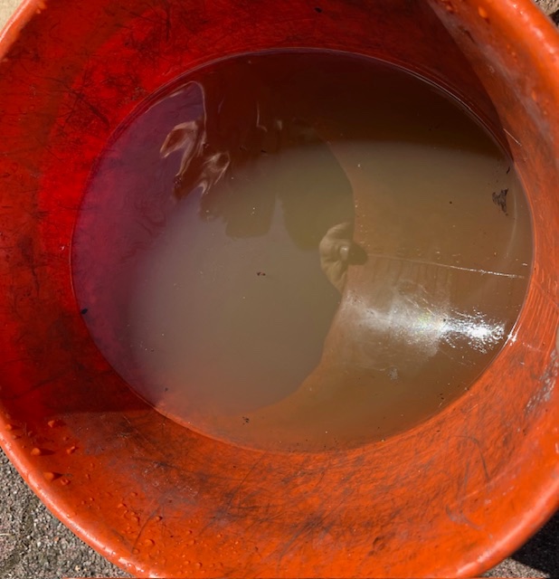 Als der Schraubkopf noch ca. 10 mm herausschaute, begann es zu tröpfeln. Das Wasser aus dem Motorrumpf war trotz zuvor mehrfachen Spülens trüb.