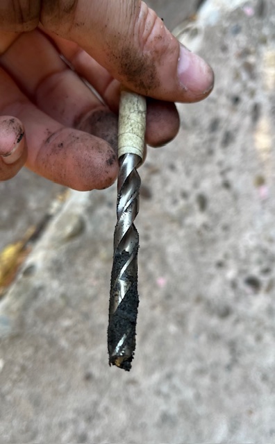 Ich habe mit einem 7er Bohrer ca. 9 cm tief von Hand gebohrt. Dabei kam schwarzes, ölig-krümeliges Sediment zutage.
