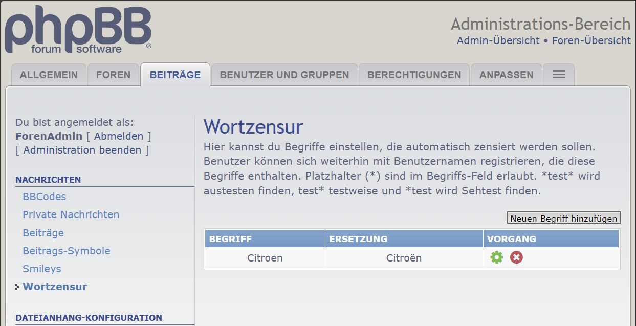 Wie auch immer, ich habe jetzt eine Wortzensur eingestellt, die genau dies erledigen sollte. Und praktischerweise erfolgt die Zensur nicht beim Verfassen, sondern bei der Anzeige, so dass auch alle bereits vorhandenen Beiträge zensiert werden.